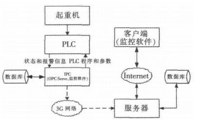 起重機安全監控系統采用了無線接入、 現場總線、3G 技術及 OPC(OLE for Process Control)等先進技術 , 具有穩定可靠、 功能全面、 界面友好、 可擴展性強等優點。 根據船廠起重機的特殊要求, 在現場采用現場總線技術將分布于設備上的傳感器、 監控設備等連接起來,然后在現場實施實時監控, 同時也可以通過 Internet 在遠程客戶端對現場工況進行實時監控。 具體來說就是,在工業現場, 利用自主開發的監控軟件采取現場起重機的運行狀態信息和報警信息, 然后把信息儲存到現場數據庫(SQL Server)中。 通過 3G Router 將監控信息發送到具有固定 IP 的中間服務器的數據庫(SQL Server)中, 遠程客戶端利用客戶端監控軟件讀取中間服務器中的數據, 實現對現場的遠程監控。 一旦出現故障, 遠程技術人員可以根據報警信息及時提出解決方案。