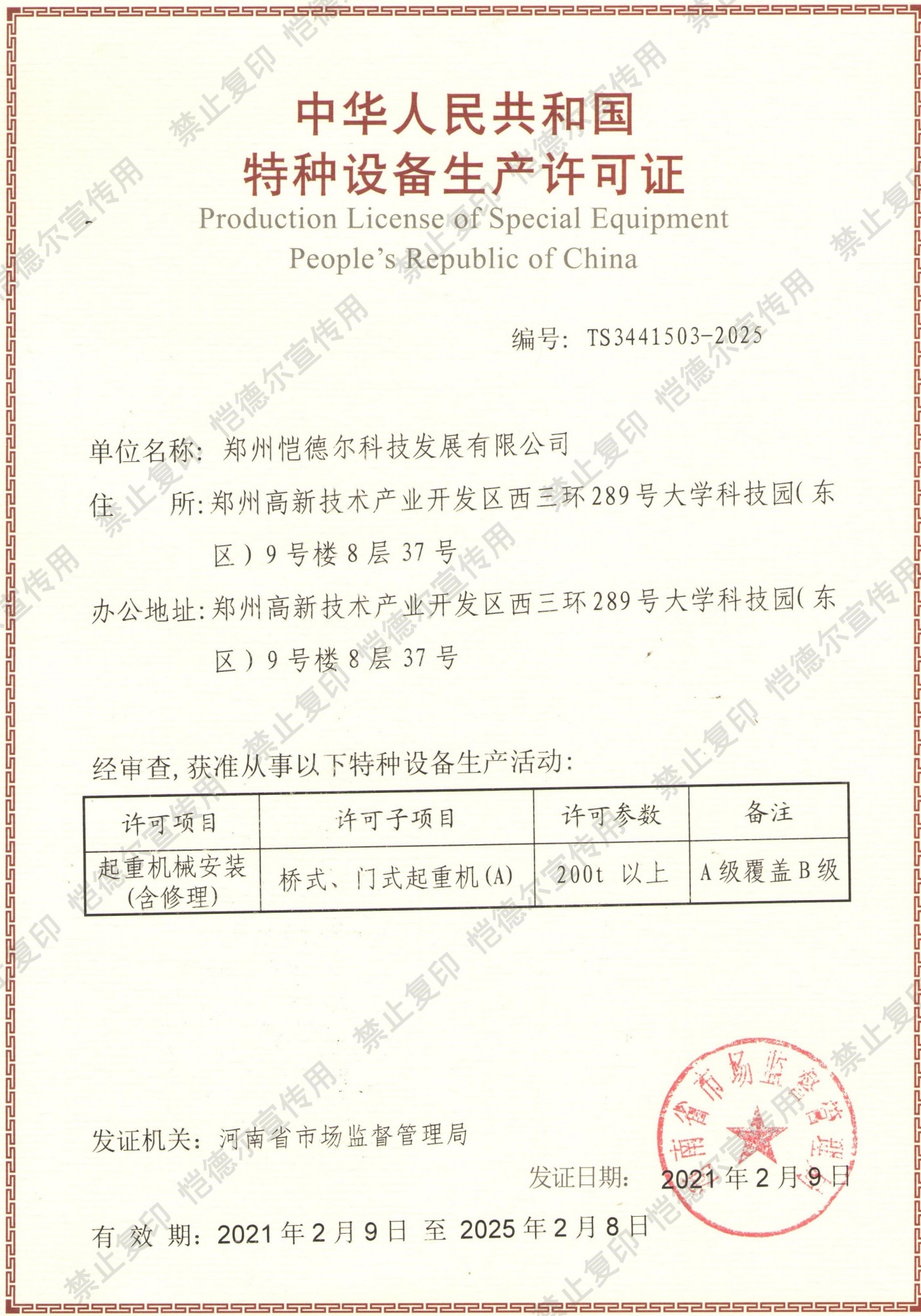 經過愷德爾科技全體員工多年不懈努力和各位專家嚴格審核,鄭州愷德爾科技最終通過評審,喜獲起重機械安裝(含修理)A級資質,期待愷德爾科技明天更美好!